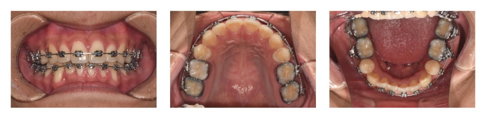 를 발치하였습니다. 이후 **브라켓(bracket)과 밴드(band)**를 부착하여 치아 배열을 진행하였습니다.